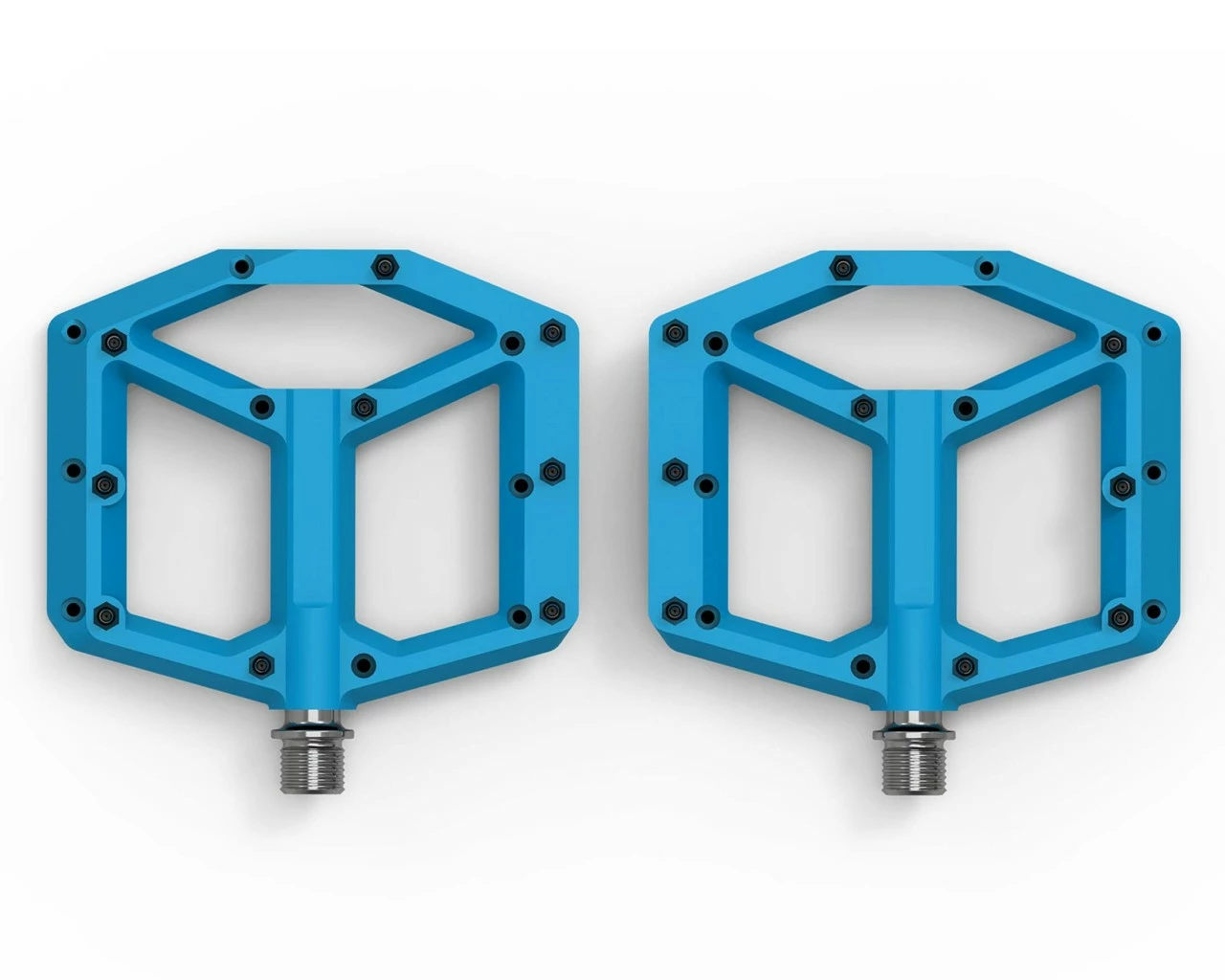 leichtes Flat-Pedal; Nylon-verstärkter-Kunststoff-Körper und CrMo Achse; angefaste Kanten für erhöhte Bodenfreiheit in Kurven; große Standfläche; extrem flache Bauweise; neun austauschbare und einstellbare Pins pro Seite; gedichtete Industrielager
