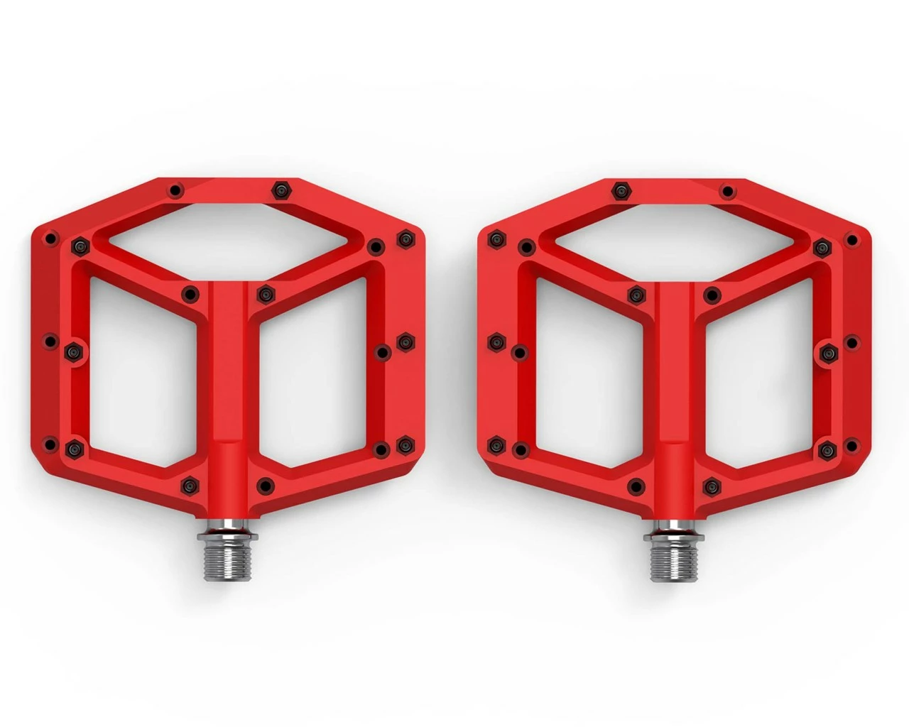 leichtes Flat-Pedal; Nylon-verstärkter-Kunststoff-Körper und CrMo Achse; angefaste Kanten für erhöhte Bodenfreiheit in Kurven; große Standfläche; extrem flache Bauweise; neun austauschbare und einstellbare Pins pro Seite; gedichtete Industrielager