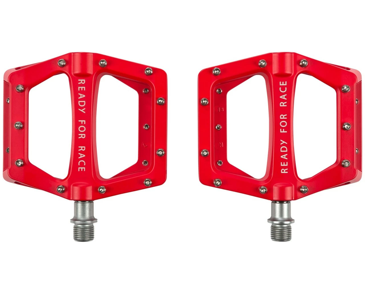 Das leichten Flat-Pedale sind aus Aluminium hergestellt und werden mit einer Cr-Mo-Achse verbaut. Die Anti-Rutsch-Pins sind austauschbar und bieten besten Halt am Fahrrad.