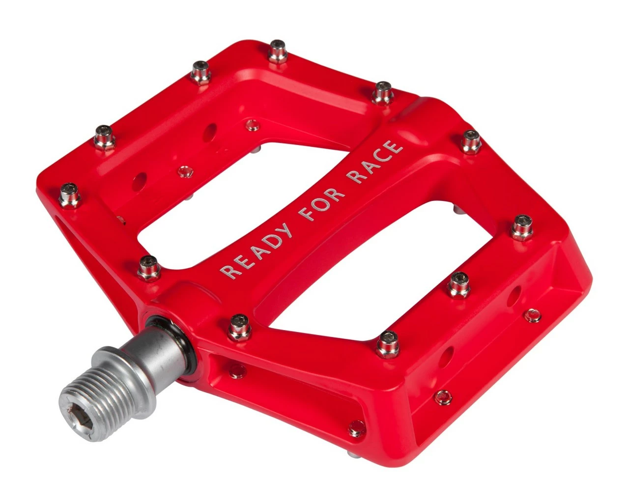 Das leichten Flat-Pedale sind aus Aluminium hergestellt und werden mit einer Cr-Mo-Achse verbaut. Die Pedale werden mit hochwertigen Lagern gelagert. Die Anti-Rutsch-Pins sind austauschbar und bieten besten Halt am Fahrrad.